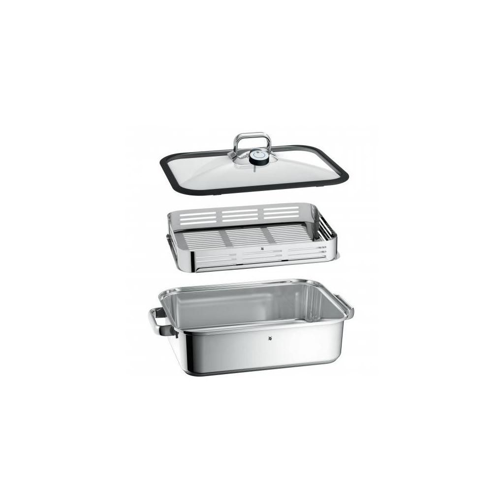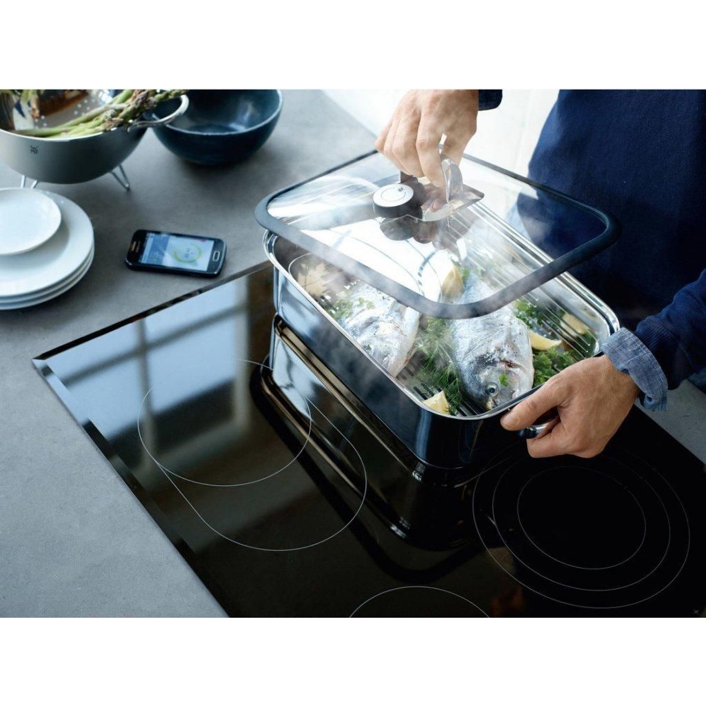 Με το ταψί ψησίματος WMF Vitalis, μπορείτε να ατμοποιείτε απαλά το φαγητό σας. Ο ατμός θεωρείται η πιο υγιεινή μέθοδος μαγειρέματος παγκοσμίως. Η αρχή είναι απλή. Κατά τη διάρκεια αυτής της διαδικασίας, η τροφή δεν βρίσκεται στο νερό και συνεπώς δεν αποβάλλει τις ουσίες που περιέχει στο νερό. Αυτό τους επιτρέπει να διατηρούν πολύτιμες βιταμίνες και μέταλλα. Ο ατμός είναι κατάλληλος για την προετοιμασία όλων των πιάτων που δεν χρειάζεται να είναι τραβηγμένα και τραγανά. Τα λαχανικά παραμένουν τρυφερά και σφιχτά, τα πουλερικά ζουμερά, τα ψάρια δεν διαλύονται. Τίποτα δεν θα στεγνώσει ή θα καεί στον ατμό. Τα τρόφιμα διατηρούν την έντονη, ιδιαίτερη γεύση τους, οπότε μπορείτε να μειώσετε σημαντικά το αλάτισμα. Η άριστη αγωγή θερμότητας μέσω του ατμού διασφαλίζει ότι τα τρόφιμα μαγειρεύονται ομοιόμορφα στο εσωτερικό. Για αυτή τη μέθοδο μαγειρέματος, η WMF έχει αναπτύξει το ιδανικό σύστημα ταψιών ψησίματος Vitalis Aroma.