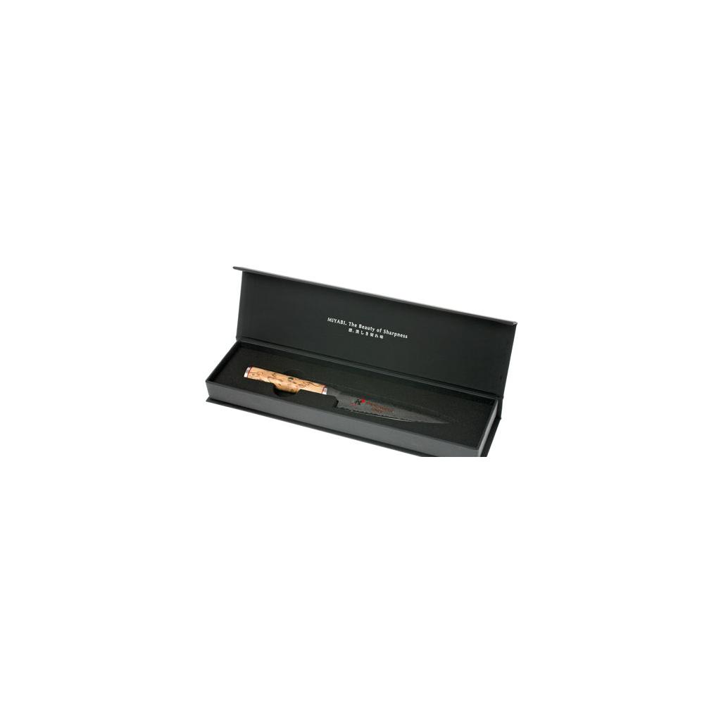 Η σειρά μαχαιριών MIYABI 5000MCD συνδυάζει τέλεια λειτουργικότητα, εργονομία και μοναδικό σχεδιασμό. Κάθε ξεχωριστό μαχαίρι είναι το αποτέλεσμα αυθεντικής χειροτεχνίας από την "πόλη των μαχαιριών" Seki. Η παραδοσιακή δεξιοτεχνία και η σύγχρονη τεχνολογία έχουν ως αποτέλεσμα την υψηλότερη δυνατή ποιότητα μεταξύ των μαχαιριών που παράγονται στο εμπόριο. Ο εξαιρετικά σκληρός πυρήνας χάλυβα Micro Carbide MC63 σε σκόνη είναι εγκιβωτισμένος σε 100 στρώματα χάλυβα δύο διαφορετικών σκληροτήτων. Το ειδικό φινίρισμα της λεπίδας προσδίδει στη λεπίδα μια πολυεπίπεδη υφή, δίνοντας σε κάθε μαχαίρι ένα πρωτότυπο , μοναδικό μοτίβο φλοράλ Damascene. Για να επιτευχθούν ακόμη καλύτερες ιδιότητες του χάλυβα, χρησιμοποιήθηκε μια μοναδική διαδικασία σκλήρυνσης CRYODUR®, κατά την οποία ο χάλυβας παγώνει στους -196°C. Το προκύπτον υλικό διαθέτει ακραία σκληρότητα 63 Rockwell. Το μαχαίρι είναι συμμετρικά λειασμένο στο χέρι σε σχήμα "V" με γωνία 19°. Το παραδοσιακό ακόνισμα με το χέρι της Honbazuke έχει αποδειχθεί από εκατοντάδες χρόνια δουλειάς από αρχιμαχαιροποιούς. Πρόκειται για μια διαδικασία λείανσης σε πολλά στάδια, όπου το μαχαίρι αρχικά ακονίζεται χρησιμοποιώντας μια κάθετη και μια οριζόντια περιστρεφόμενη πέτρα λείανσης και τέλος η λεπίδα γυαλίζεται με μια δερμάτινη ζώνη λείανσης. Χάρη στη σφηνοειδή κοπτική ακμή, η λεπίδα διεισδύει εύκολα στα τρόφιμα. Η κλασική λαβή σε σχήμα "D" είναι κατασκευασμένη από σημύδα Masur. Η υφή και ο κόκκος του ξύλου είναι μοναδικά σε κάθε κομμάτι. Το υλικό που χρησιμοποιείται συμβολίζει απόλυτα τον ιαπωνικό σεβασμό για τη φύση. Η εκλεπτυσμένη διακόσμηση της λαβής έγκειται στις λεπτομέρειες ασιατικού στυλ - η βάση από ανοξείδωτο ατσάλι με το λογότυπο, η διακοσμητική καρφίτσα με μωσαϊκό και η κόκκινη γραμμή προσφέρουν μια ισχυρή αισθητική εμπειρία.