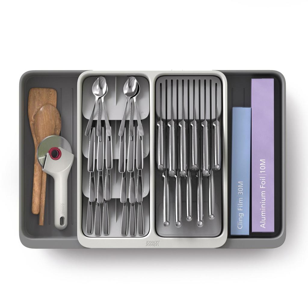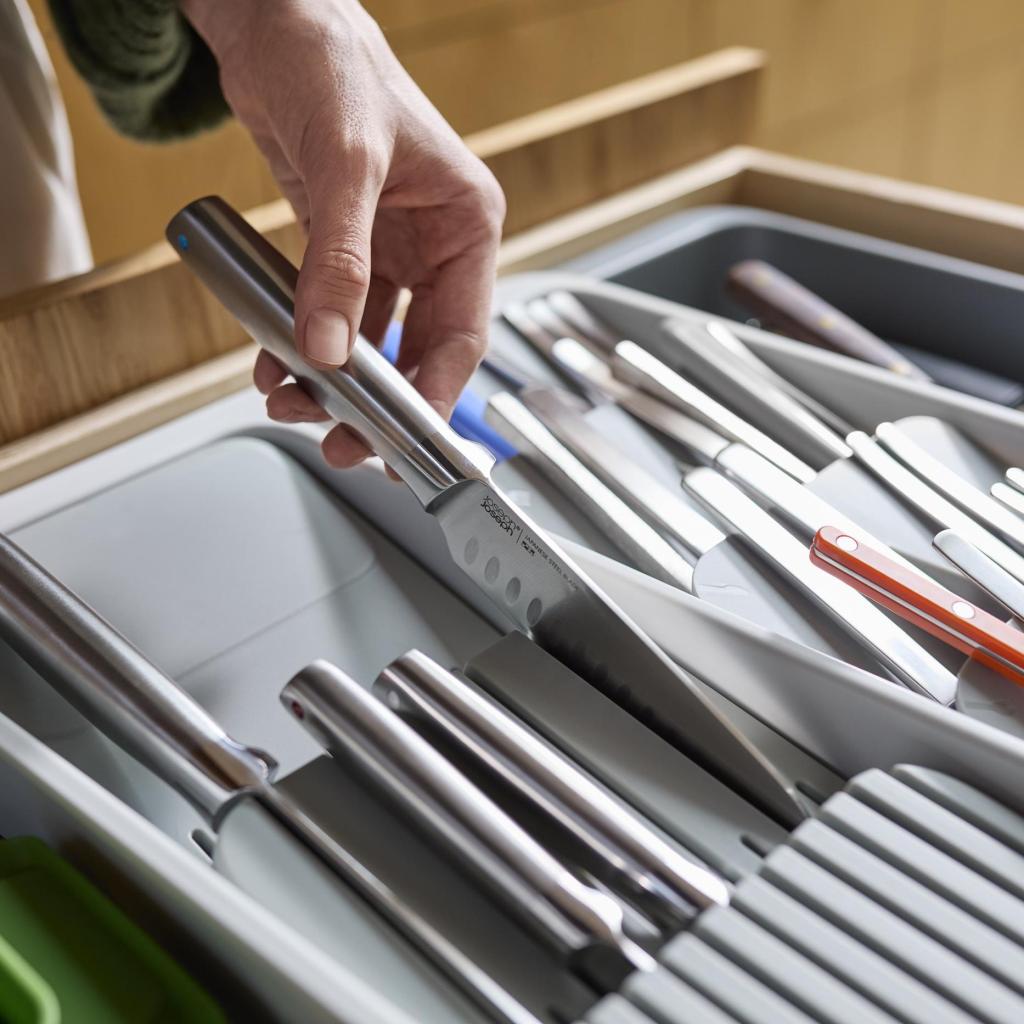 - Ο διοργανωτής συρταριού Joseph Joseph DRAWERSTORE βοηθά στην τακτοποιημένη οργάνωση μαχαιροπίρουνων, μαχαιριών και ξύλινες κουτάλες μαγειρικής σε ένα συρτάρι κουζίνας.