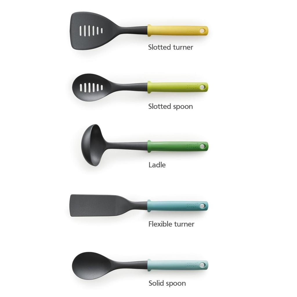 - Το σετ περιλαμβάνει μια σπάτουλα με τρύπες, μια τρυπητή κουτάλα, μια κουτάλα σούπας, μια ευέλικτη σπάτουλα και μια συμπαγή κουτάλα κουζίνας, προσφέροντας έτσι πλήρη εξοπλισμό για ανακάτεμα, γύρισμα και σερβίρισμα φαγητών.