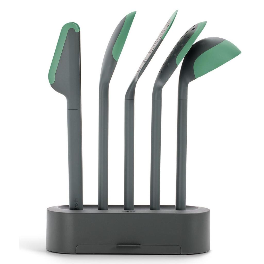 - Εκτός από τα ίδια τα εργαλεία, η συσκευασία περιλαμβάνει επίσης μια πρακτική βάση που εξοικονομεί χώρο στον πάγκο της κουζίνας χάρη στο στενό της σχήμα.
