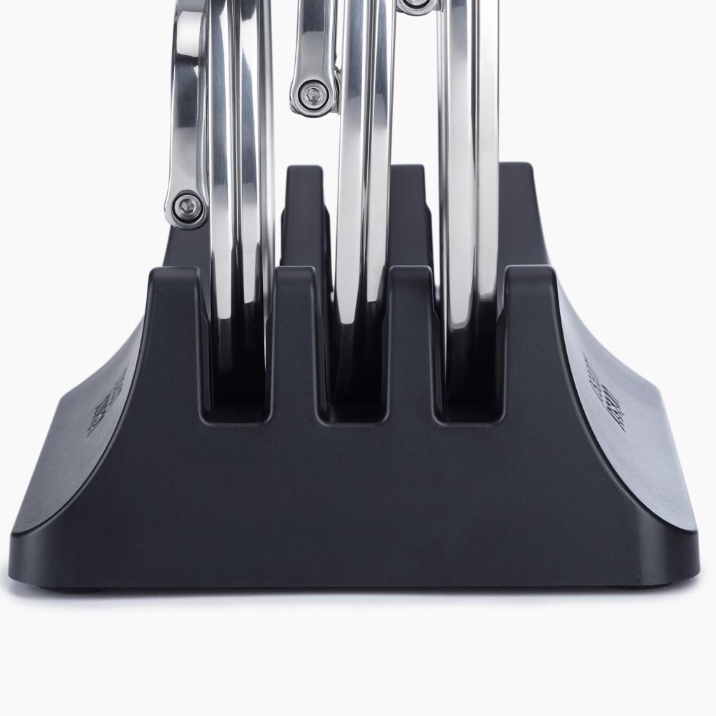 - Το προφίλ των επιμέρους θηκών είναι καμπυλωτό, ώστε να ακολουθεί το σχήμα των καπακιών κατσαρόλας και να υποστηρίζει τη σταθερή τους τοποθέτηση.
