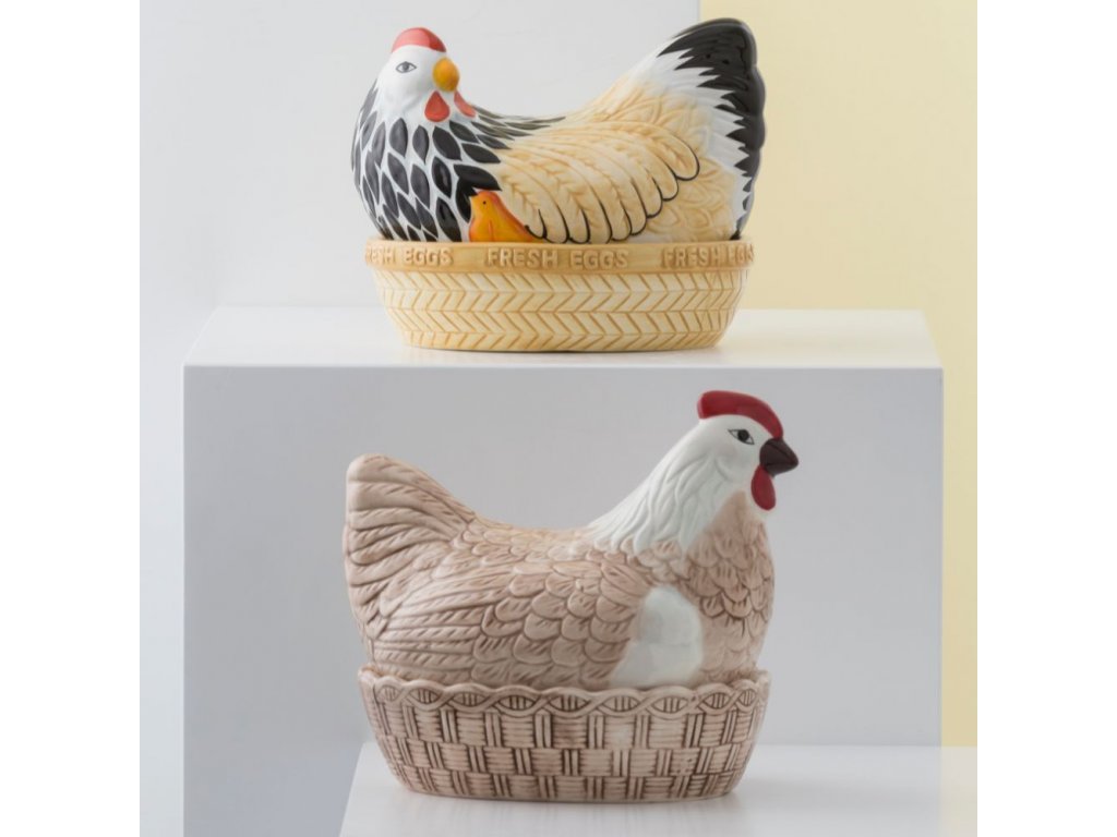 - κομψό μπολ με καπάκι σε σχήμα κότας, που κάθεται πάνω σε ύφασμα