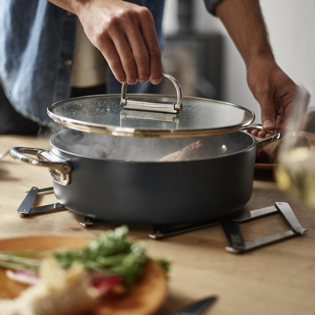 - Η κατασκευή είναι ανθεκτική στη θερμότητα έως 340 °C, οπότε μπορεί άφοβα να αντέξει πολύ ζεστά σκεύη απευθείας από τον φούρνο.