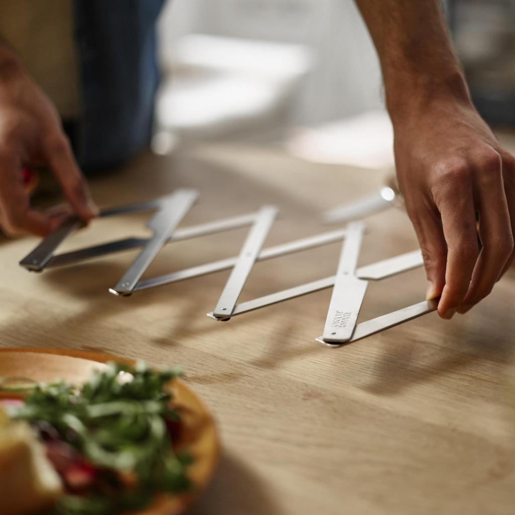 - Βάση για σκεύη μαγειρικής Joseph Joseph SPACE προστατεύει τους πάγκους εργασίας και τα τραπέζια φαγητού από τις υψηλές θερμοκρασίες χάρη σε έναν επεκτεινόμενο μεταλλικό μηχανισμό.