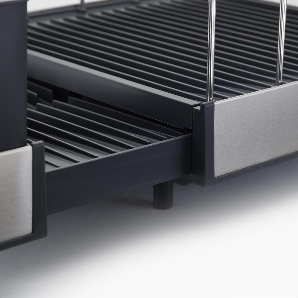 - Η αναδιπλούμενη σχεδίαση επιτρέπει την αύξηση της επιφάνειας αποστράγγισης σχεδόν στο διπλάσιο μέγεθος, ώστε να χωράει άνετα και μεγαλύτερες κατσαρόλες, τηγάνια ή άλλα μαγειρικά σκεύη.