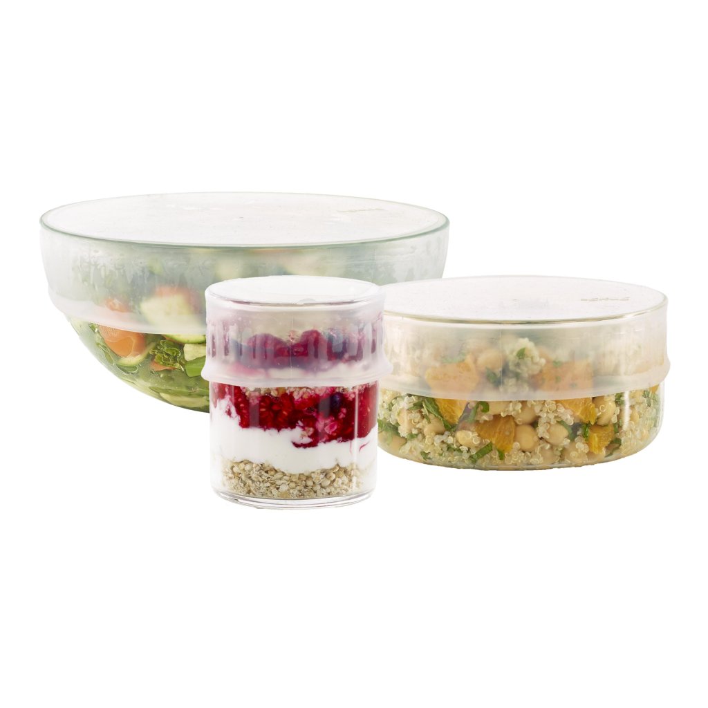 - Αυτό το σετ 3 επαναχρησιμοποιούμενων καπακιών σιλικόνης Lékué χρησιμοποιείται για την αποθήκευση τροφίμων ως μια πρακτική και φιλική προς το περιβάλλον εναλλακτική λύση στις συσκευασίες μιας χρήσης.