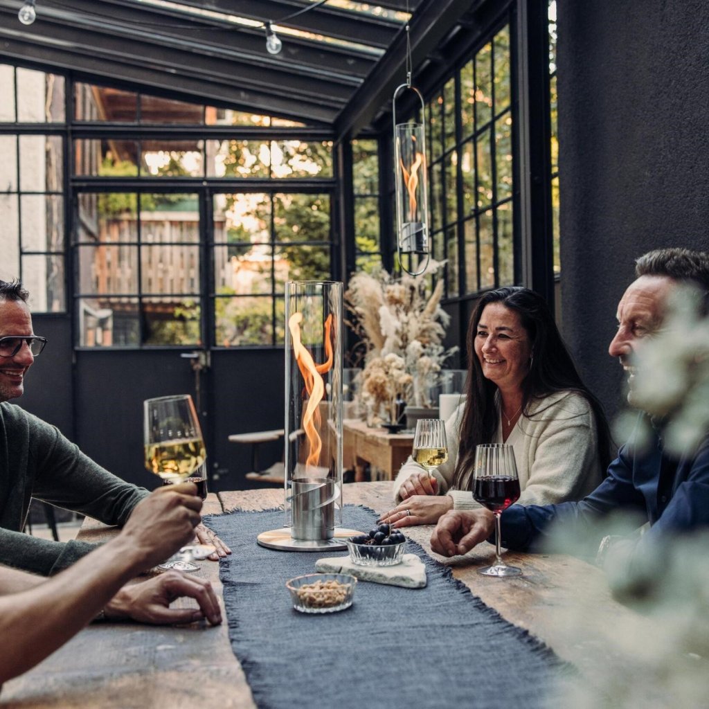 - ο γυάλινος κύλινδρος προστατεύει τη φλόγα από τον άνεμο και χρησιμεύει επίσης ως φράγμα ασφαλείας, καθιστώντας το τζάκι ασφαλές στη χρήση ακόμη και παρουσία παιδιών ή κατοικίδιων ζώων