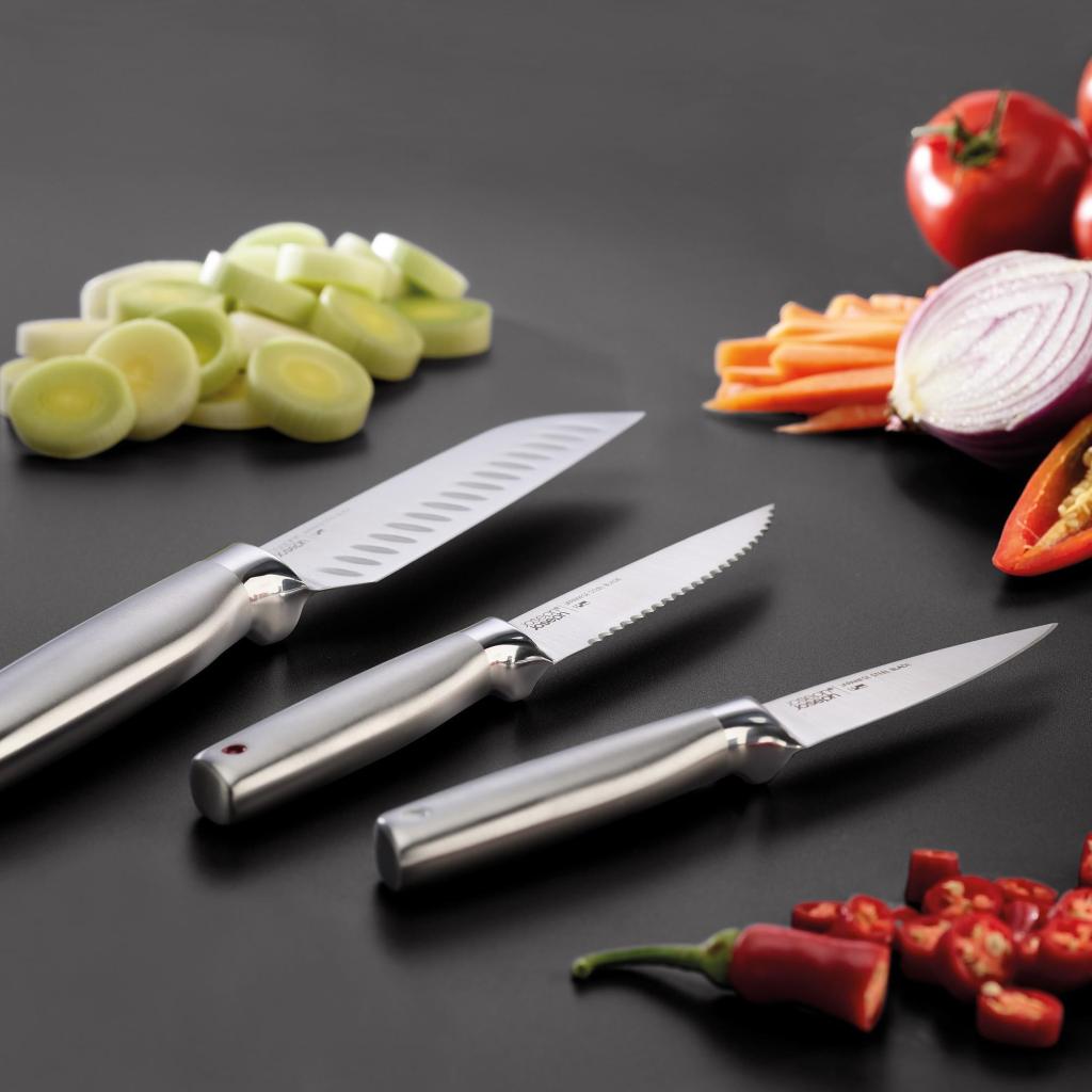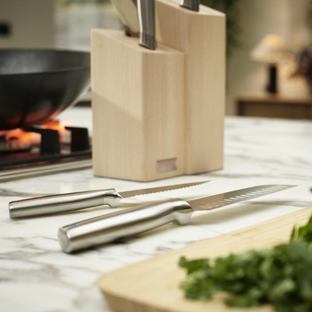 Η μαγειρική ξεκινά μερικές φορές αρκετά αισιόδοξα. Ετοιμάζετε τα υλικά, βγάζετε την σανίδα κοπής και μετά έρχεται η στιγμή που αρχίζετε να ψάχνετε ένα μαχαίρι που θα ταίριαζε πραγματικά για τη συγκεκριμένη εργασία. Η βάση με ένα πλήρες σετ, ωστόσο, τερματίζει κομψά αυτή την κουζινο-ντετέκτιβ ιστορία πριν καν αρχίσει.