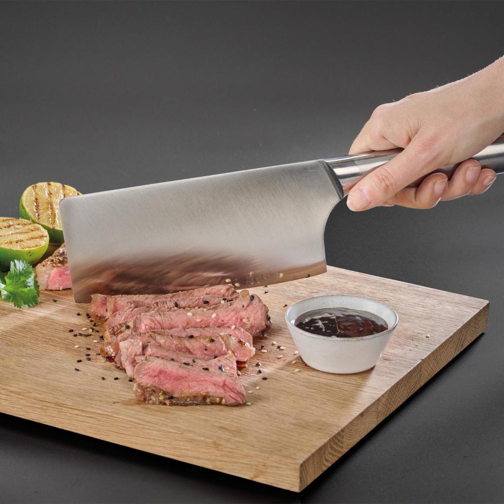 - Το σετ περιλαμβάνει επίσης έναν στιβαρό μπαλτάς με μήκος λεπίδας 16 εκατοστών, κατάλληλο για τεμαχισμό μεγαλύτερων κομματιών κρέατος ή σκληρότερων λαχανικών.