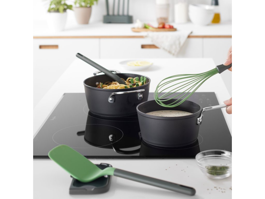 - η λαβή από PBT (άκαμπτο και υγιεινό υλικό) αντέχει έως και 180°C, ώστε το σκεύος να μπορεί να ακουμπάει σε καυτή επιφάνεια, όπως η άκρη της κατσαρόλας, κατά τη διάρκεια του μαγειρέματος