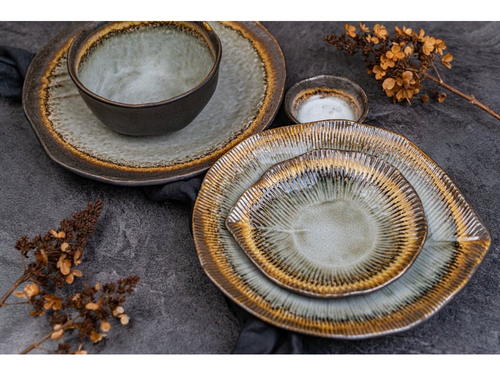 Σε αυτή τη συσκευασία θα βρείτε ένα πολύ ενδιαφέρον ασύμμετρο μπολ με ακανόνιστο χείλος από τη συλλογή Akane Grey, με διάμετρο 24/22 cm. Γυαλιστερό μπολ με κρακελέ γάνωμα έχει γκρι χρώμα, κίτρινες γραμμές και καφέ άκρες.