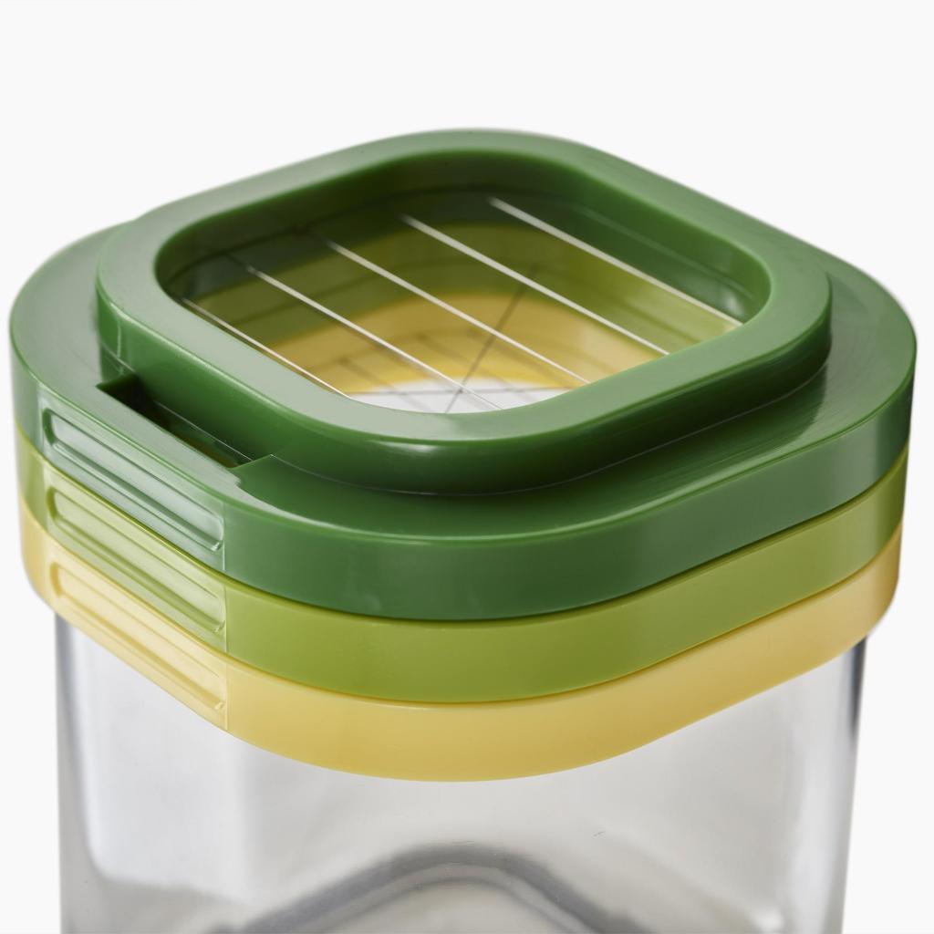 - Η διάφανη σχεδίαση του δοχείου επιτρέπει την εύκολη παρακολούθηση της ποσότητας των προετοιμασμένων υλικών κατά το κόψιμο.