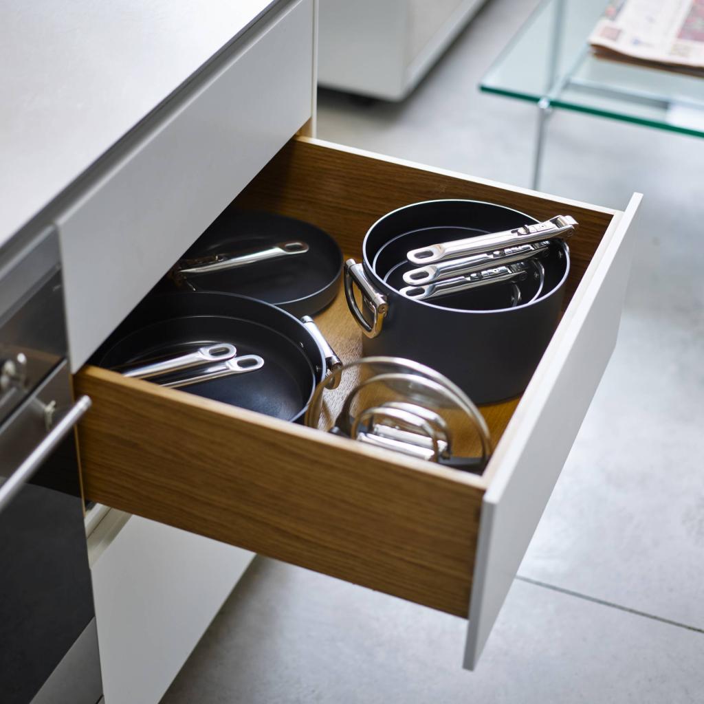 - Χάρη στις αναδιπλούμενες λαβές, οι κατσαρόλες μπορούν εύκολα να στοιβαχτούν η μία μέσα στην άλλη, εξοικονομώντας έως και 50% περισσότερο αποθηκευτικό χώρο σε σύγκριση με τα συμβατικά σκεύη.