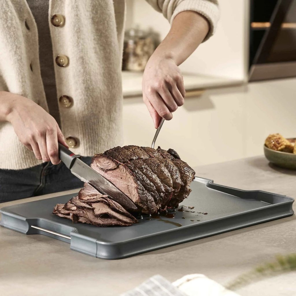 - η επιφάνεια κοπής είναι κεκλιμένη, έτσι ώστε οι χυμοί του κρέατος να τρέχουν προς τη μία πλευρά της σανίδας κοπής