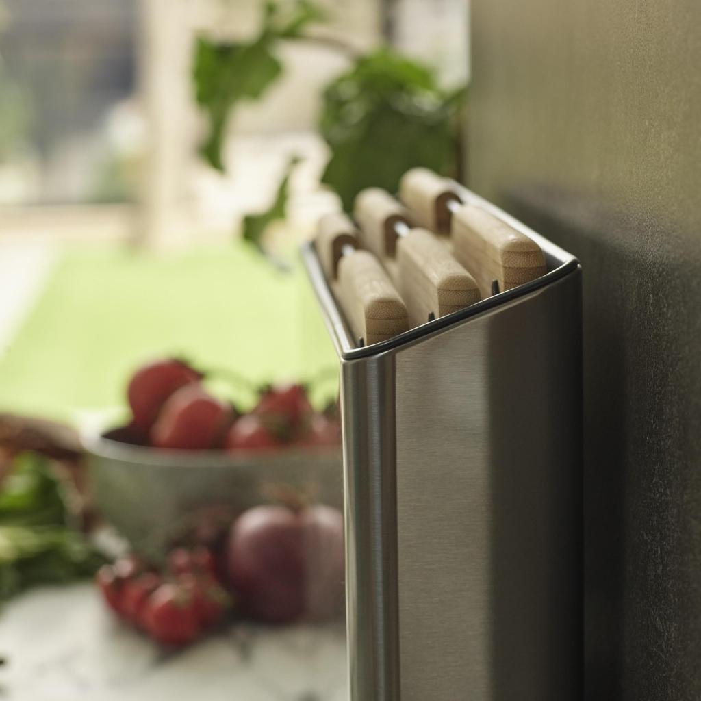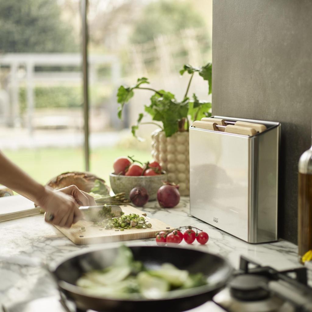 - Η πρακτική βάση από ανοξείδωτο ατσάλι παρέχει συμπαγή αποθηκευτικό χώρο, ο οποίος βοηθά στη διατήρηση των ξύλων κοπής τακτοποιημένων στον πάγκο της κουζίνας.