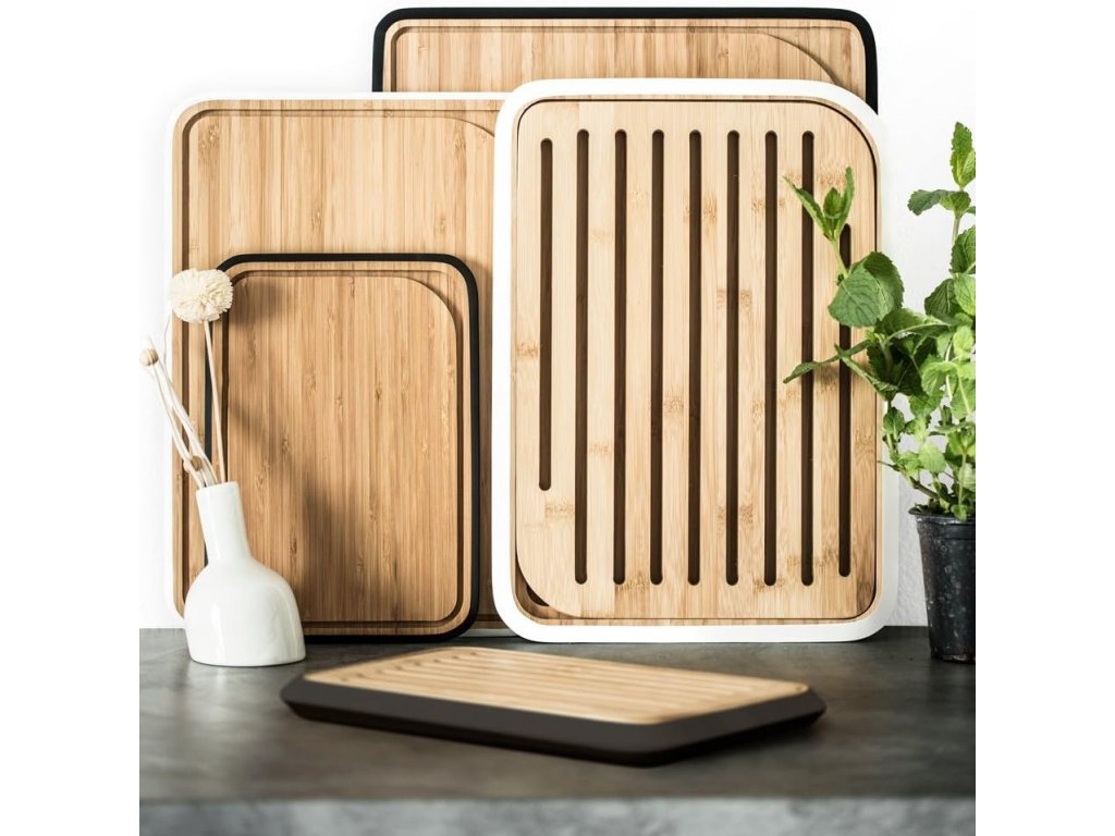 - η εγκοπή στην άκρη της σανίδας κοπής εμποδίζει τη διαρροή χυμών και συγκρατεί τα ψίχουλα