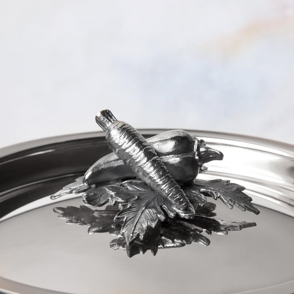 - καπάκι από μασίφ ανοξείδωτο ατσάλι με λαβή σε όμορφο ντεκόρ, το οποίο είναι χυτό στο χέρι από μασίφ μπρούντζο και επάργυρο