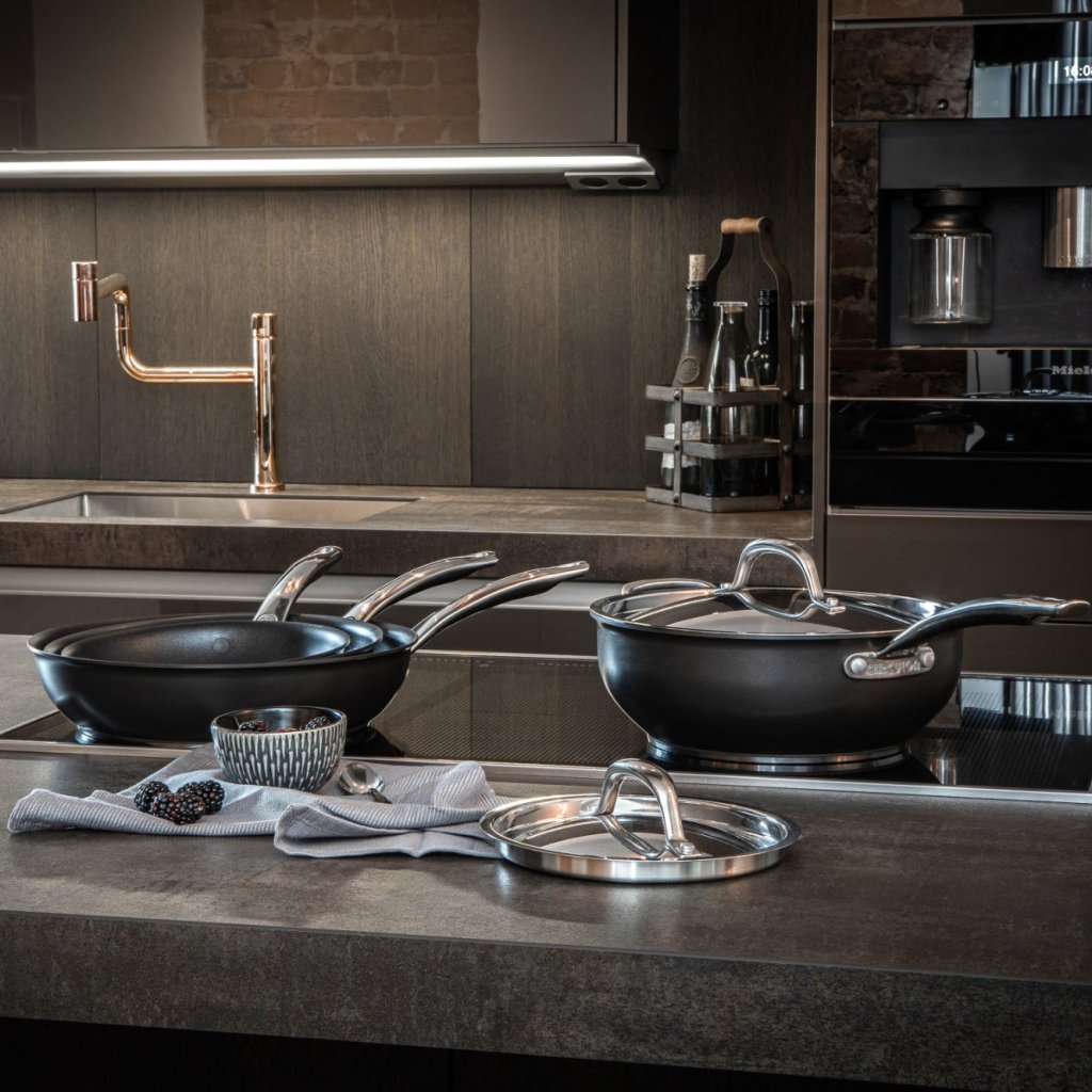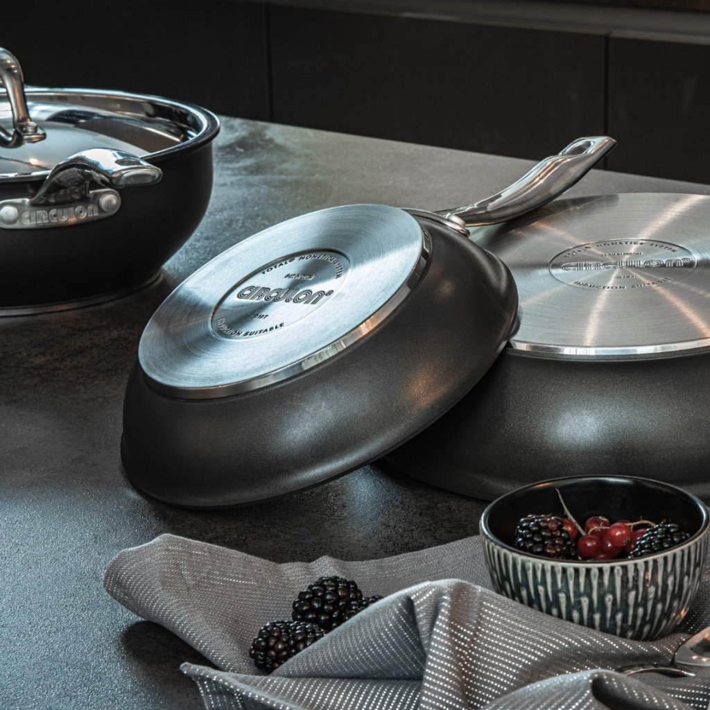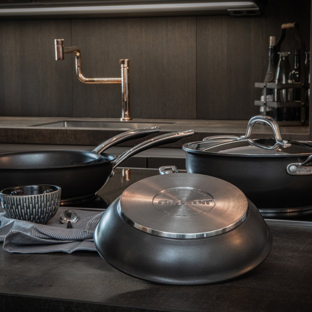 - η κατασκευή με πυρήνα αλουμινίου και εξαιρετικά παχιά βάση από χάλυβα κατανέμει ομοιόμορφα τη θερμότητα σε ολόκληρη την επιφάνεια του μαγειρικού σκεύους, βοηθώντας στην αποφυγή του καψίματος και εξασφαλίζοντας ακριβή έλεγχο του μαγειρέματος