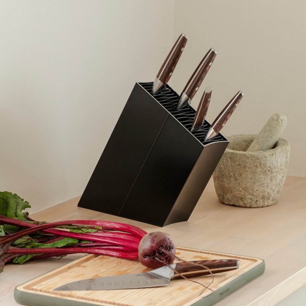 - ο συνδυασμός γυαλιστερού ατσαλιού και σκούρου ξύλου προσδίδει στο μαχαίρι μια κομψή εμφάνιση εμπνευσμένη από το σκανδιναβικό design