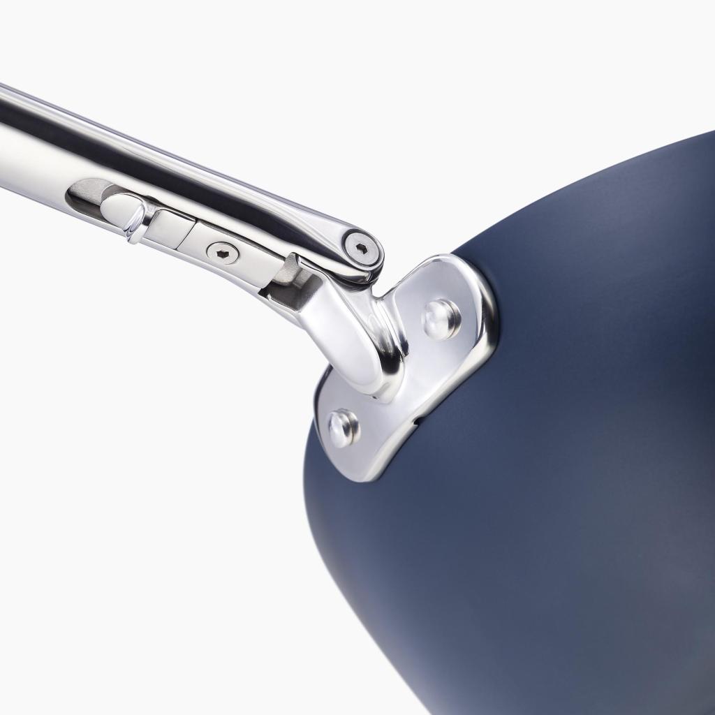 - Η βοηθητική λαβή είναι επίσης αναδιπλούμενη, επιτρέποντας στο τηγάνι να αποθηκεύεται συμπαγώς και να διατηρεί τη μέγιστη εξοικονόμηση χώρου αποθήκευσης.