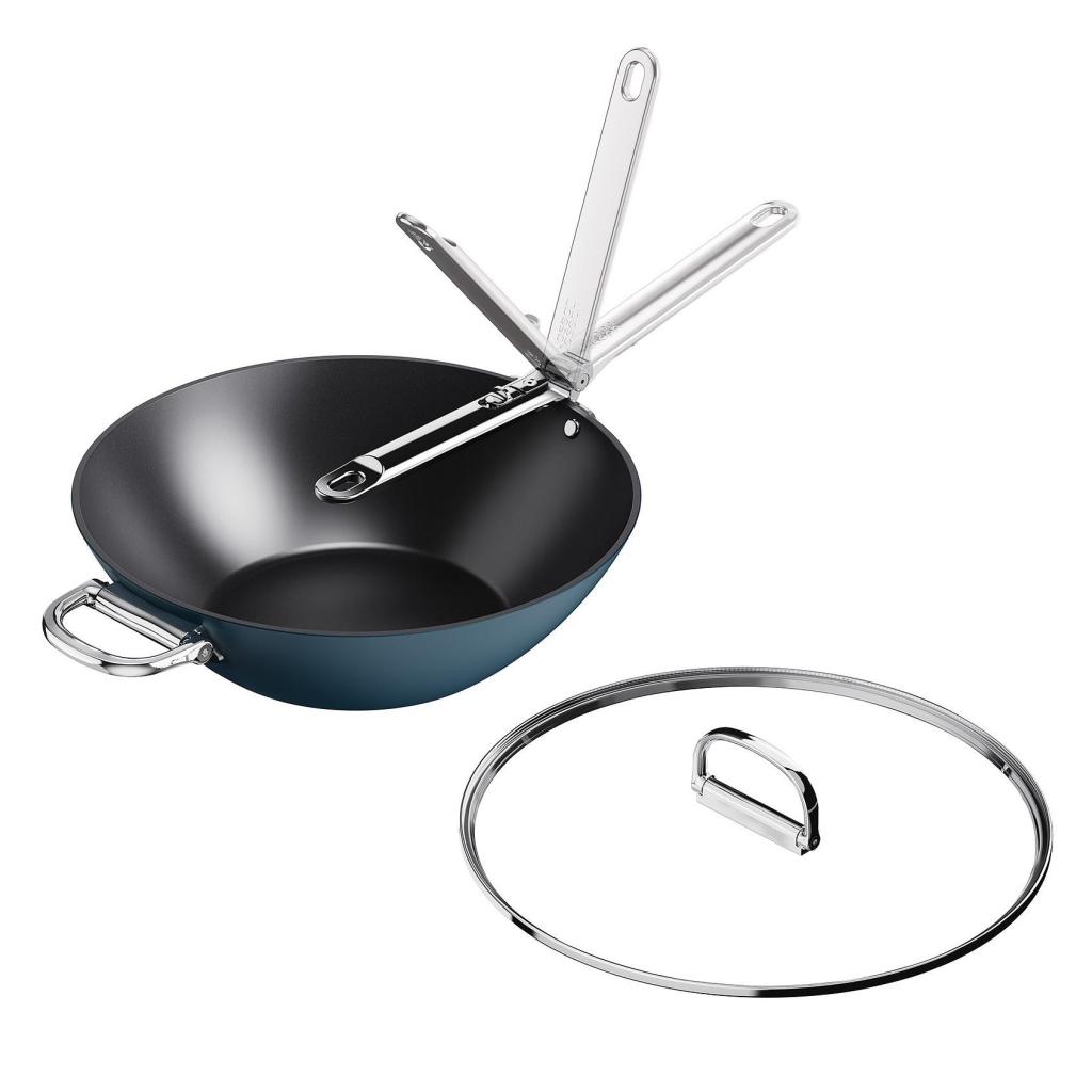 - Χάρη στον αναδιπλούμενο μηχανισμό, η λαβή μπορεί εύκολα να διπλωθεί κατά μήκος του σώματος του wok, επιτρέποντας την εξοικονόμηση έως και πενήντα τοις εκατό του χώρου σε σύγκριση με τα συνηθισμένα σκεύη.