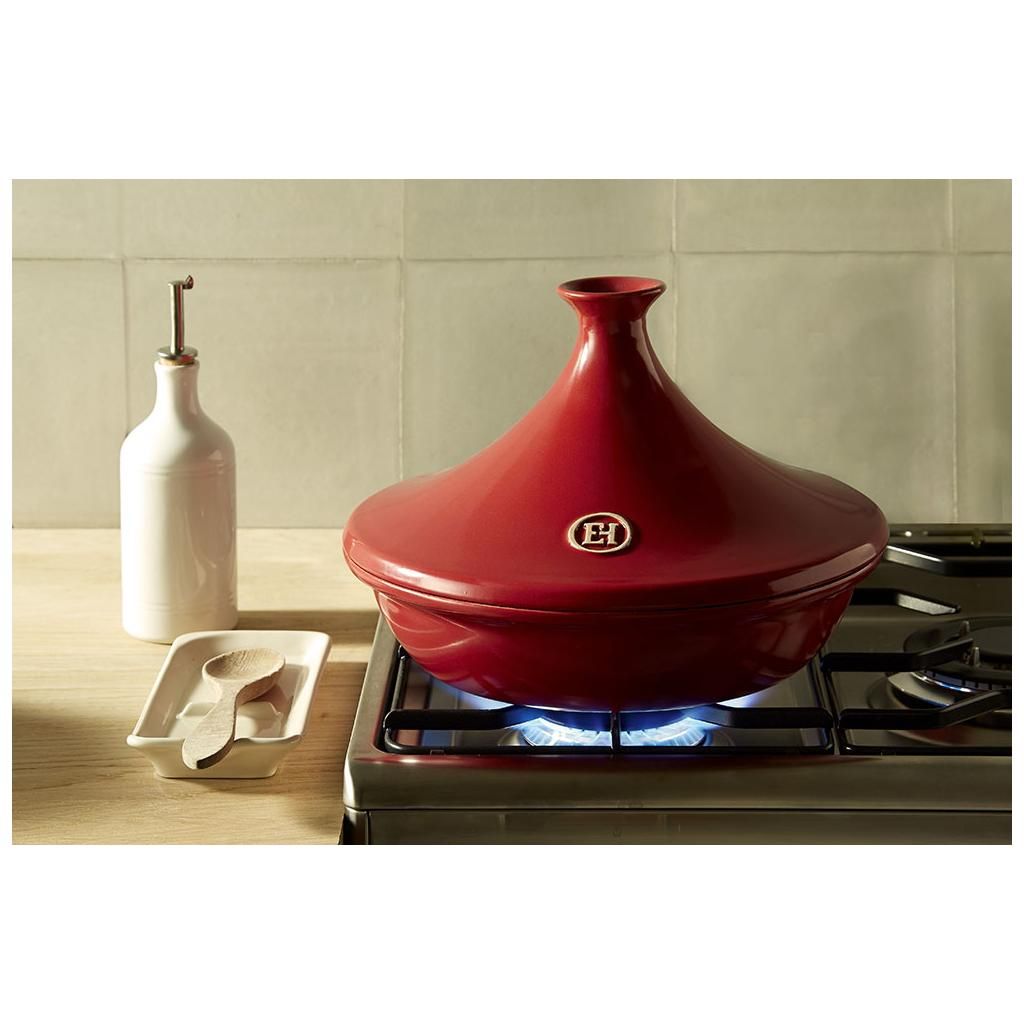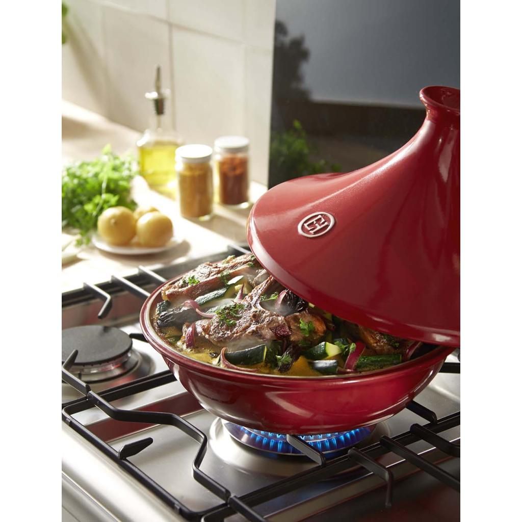Το Tajine είναι μια κατσαρόλα από υαλωμένο κεραμικό με μυτερό καπάκι που επιτρέπει στον ατμό να κυκλοφορεί καλά και βοηθά να διατηρούνται τα υλικά τρυφερά και αρκετά υγρά. Το δοχείο μπορεί να χρησιμοποιηθεί είτε στη φωτιά είτε στο φούρνο. Είναι ιδανικό για την παρασκευή μαροκινών ταζίν, μαγειρευτών φαγητών και όλων των πιάτων που απαιτούν αργή διαδικασία σιγομαγειρέματος για να αναδείξουν τις γεύσεις τους.